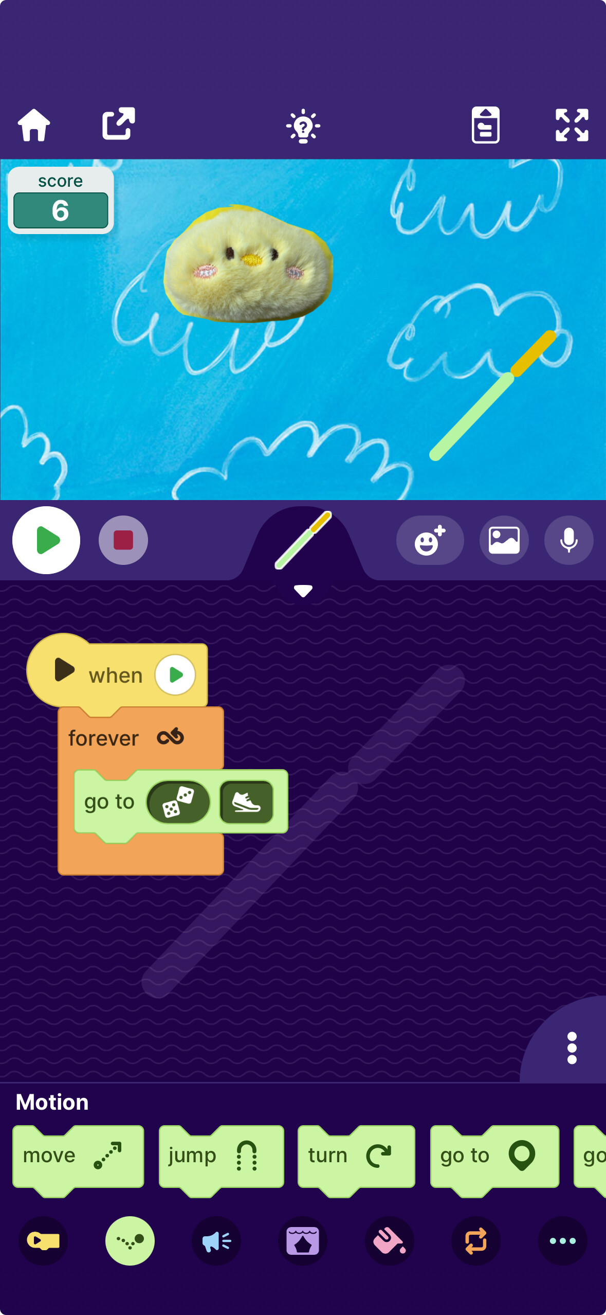 The code blocks for the chick shows tilt and scoring. When the chick touches the Pocky, it makes a chomp sound and gets a point! But if it touches the edges, it glows red and loses a point. This makes it a little more challenging!