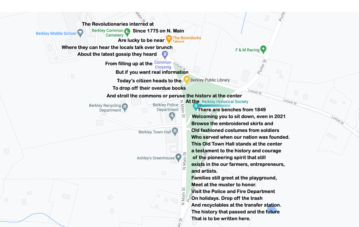 I started working on this project by exploring our local history collection and pulling works by local poets. I think I got a bit ahead of myself (and ended up running short on time ). I decided to start cutting out words from all of the maps I had printed and use the common themes I found in them to assemble some kind of poem using only those words. Since many of the places nearby are food places, it became a poem about breakfast! I pasted it over the part of the map where my hometown would be, if it had been included on the map. My biggest challenge with this was finding maps that I could print with text that was large enough to be workable. What I came up with ended up being very tiny! I added a zoomed in photo of the actual poem itself. My plan moving forward is to continue adding to this same map from week to week, so I’ll have a compilation of works all in the same place.